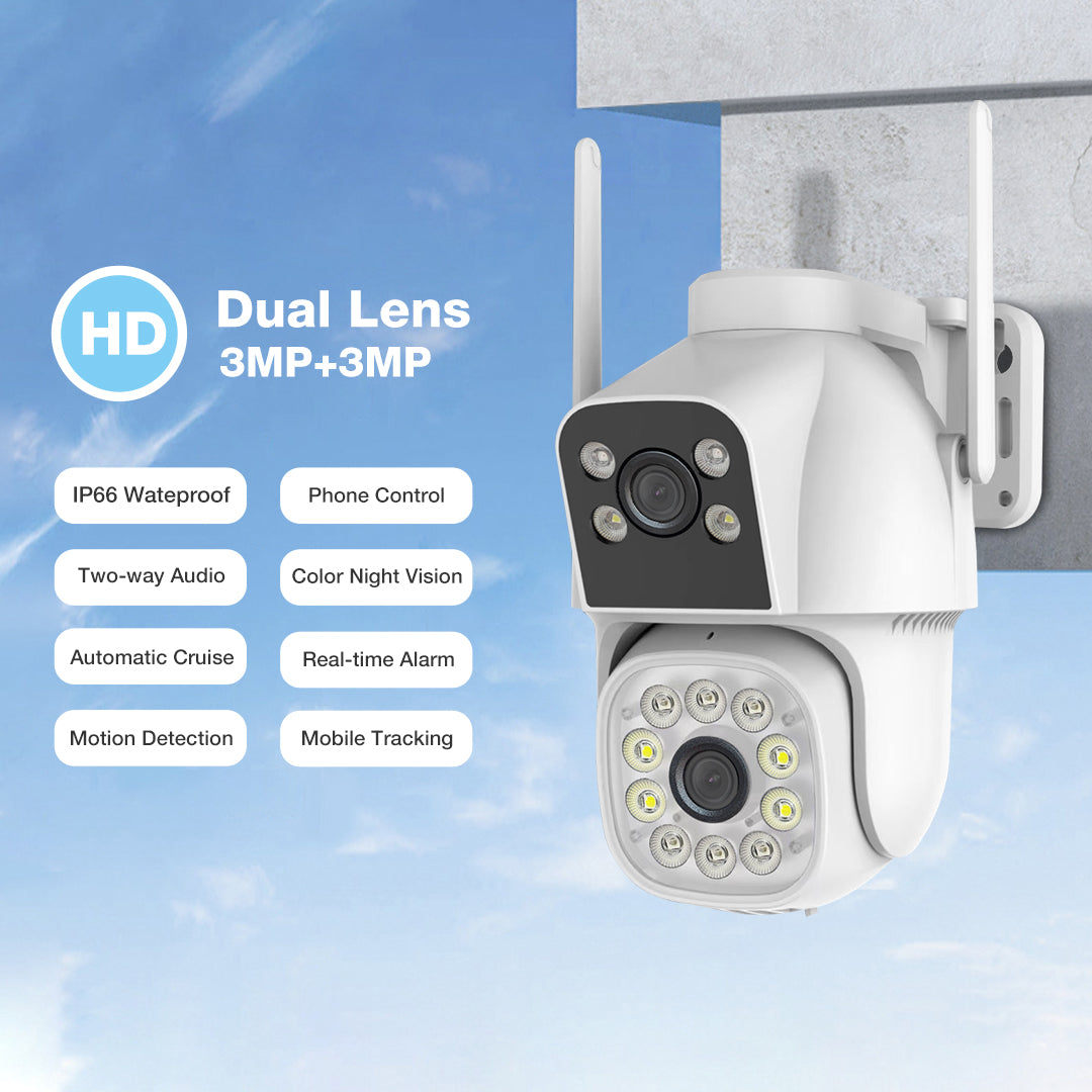 • 6 million pixels and full-color night vision. 3MP + 3MP dual-lens dual-screen, which can bring you ultra-clear color images. Built-in spotlight, enabling bright and clear full-color images even in the darkest night.